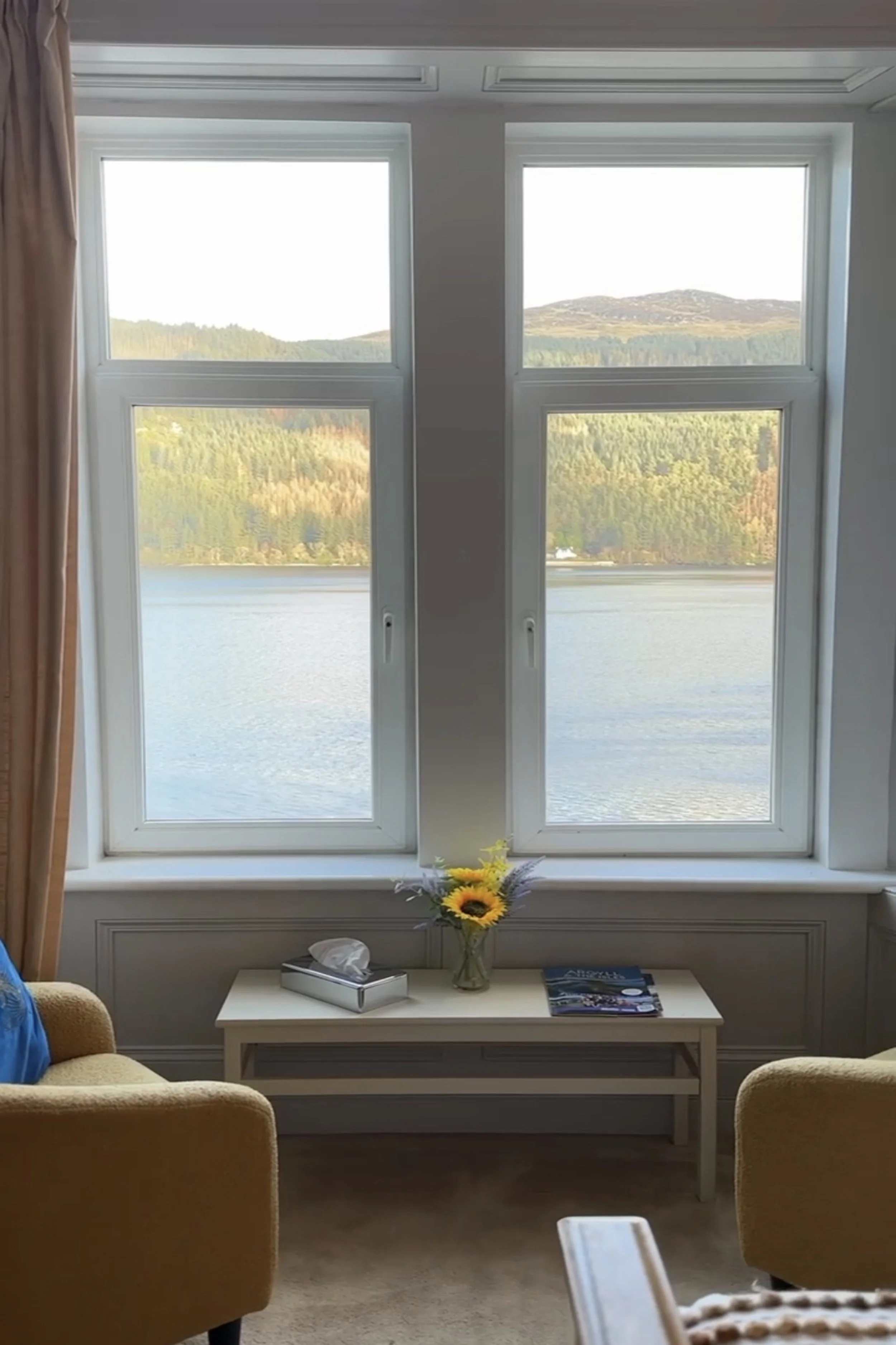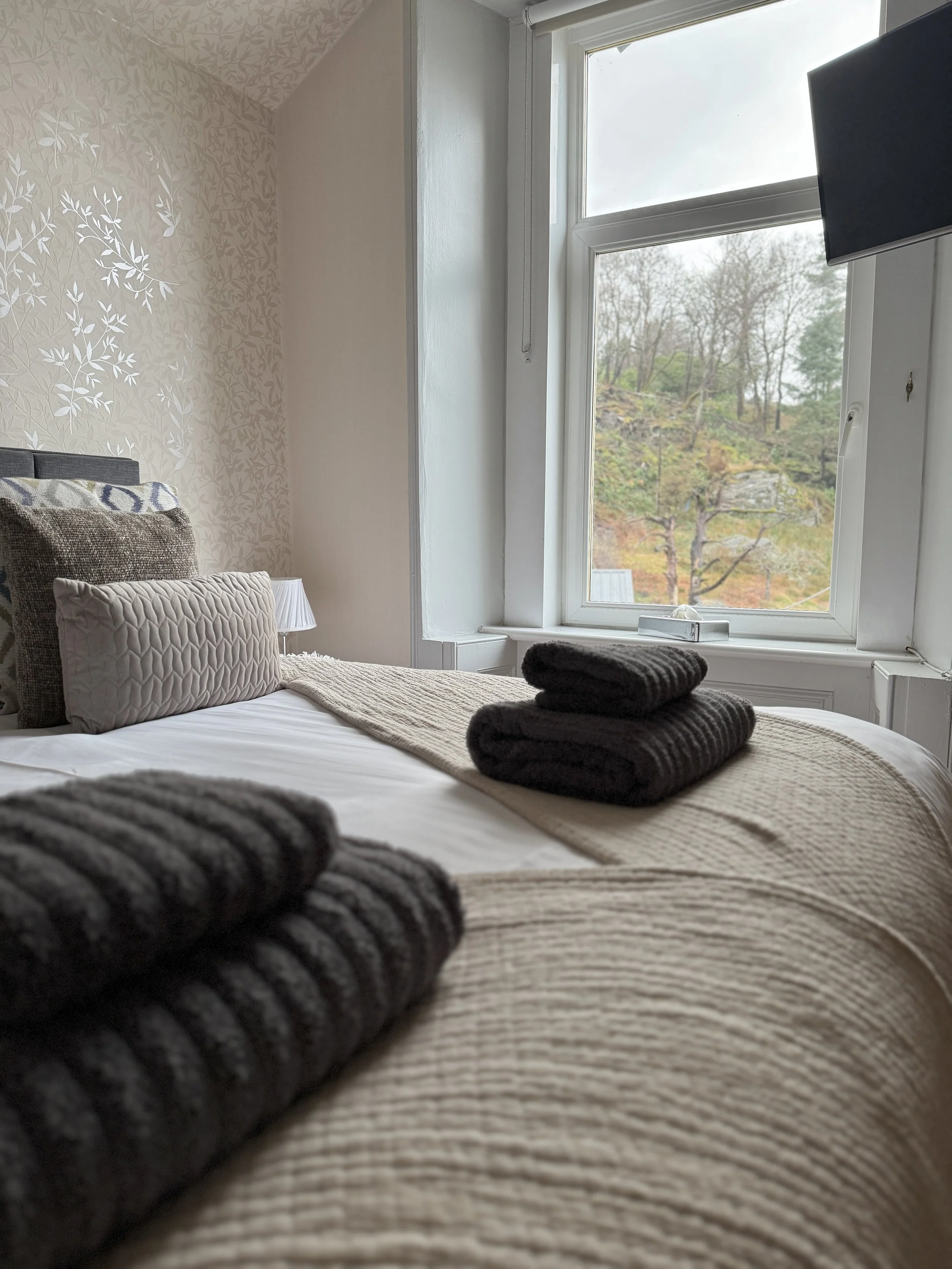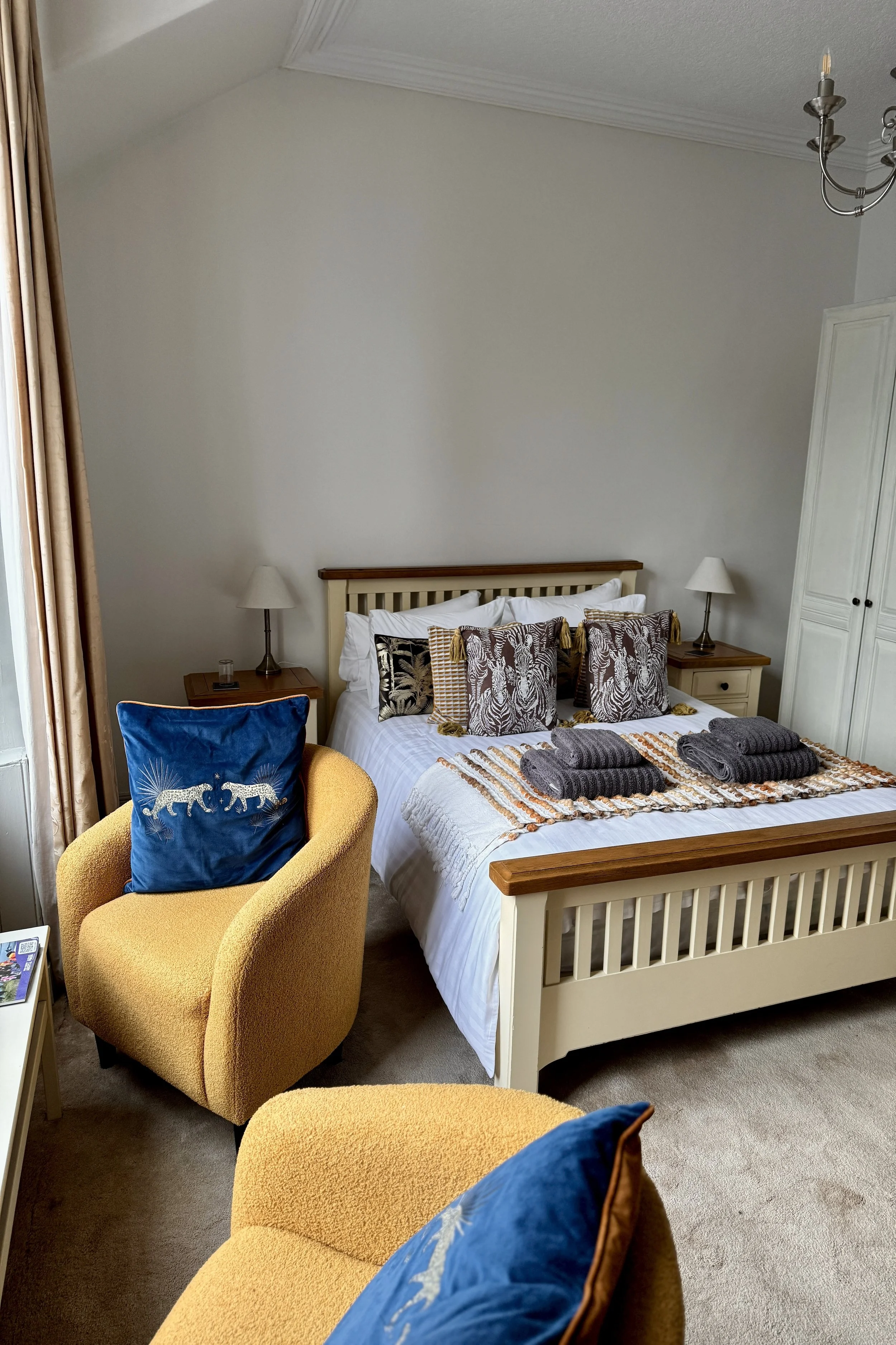 Our largest room boasts breathtaking views across Loch Goil — the perfect spot to enjoy your morning coffee while watching for seals from the comfort of your room. This beautifully appointed space features a king-sized bed and a spacious en-suite bathroom with a rainfall shower, offering a peaceful and luxurious retreat.